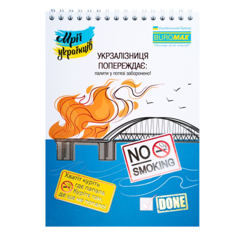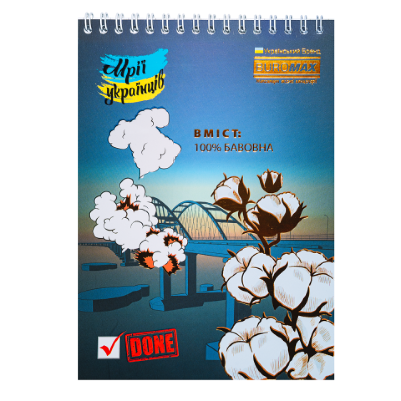 Блокноти PATRIOT від BUROMAX – це актуальне рішення для збереження записів, нотаток, думок. Цікаві обкладинки, що містять мотивуючі висловлювання, спрямовані на зарядку позитивом, вірою у фортецю та перемогу, мають візуалізацію думок та мрій багатьох людей, обов'язково сподобаються широкому колу як маленьких, так і дорослих українців. Завдяки лінійці різноманітних дизайнів такий блокнот може стати приємним актуальним подарунком або незамінним другом для кожного. Формат ±А5 Кріплення зверху на металевій білій пружині дозволяє легко перевертати листи (все лягає ідеально) Ліновка клітина, без рамки 48 аркушів Внутрішній блок – офсетний папір білого кольору щільністю 55 г/м² Обкладинка з целюлозного крейдованого картону щільністю 23 – вибірковий УФ лак та тиснення фольгою у тон дизайну Групова упаковка: 8 шт. асорті дизайнів (4 дизайни) 1 гривня на ЗСУ (1 грн з купівлі цього товару ТОВ " Імпорт-Офіс Україна " перерахує до фонду " Повернись живим " )