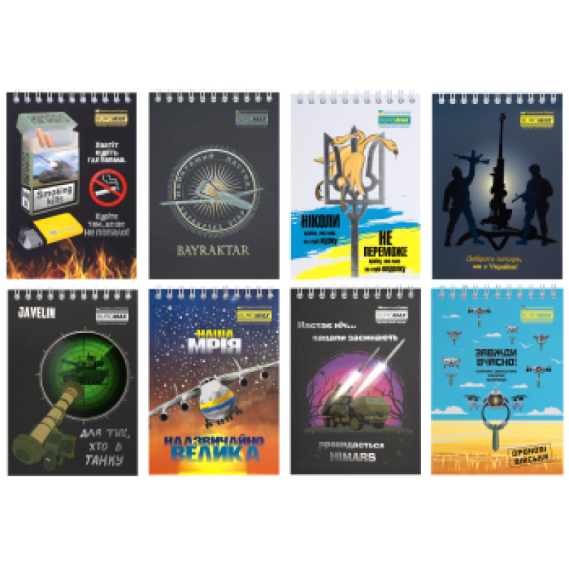 Блокноти PATRIOT від BUROMAX – це актуальне рішення для збереження записів, нотаток, думок. Цікаві обкладинки, що містять мотивуючі висловлювання, спрямовані на зарядку позитивом, вірою у фортецю та перемогу, мають візуалізацію думок та мрій багатьох людей, обов'язково сподобаються широкому колу як маленьких, так і дорослих українців. Завдяки лінійці різноманітних дизайнів такий блокнот може стати приємним актуальним подарунком або незамінним другом для кожного. Формат ±А6 Кріплення зверху на металевій білій пружині дозволяє легко перевертати листи (все лягає ідеально) Ліновка клітина, без рамки 48 листів Внутрішній блок – офсетний папір білого кольору щільністю 55 г/м² Обкладинка з целюлозного крейдованого картону щільністю 23 - Вибірковий УФ або структурний лак, тиснення фольгою в тон дизайну Групова упаковка: 16 шт. асорті дизайнів (8 дизайнів) 1 гривня на ЗСУ (1 грн з купівлі цього товару ТОВ " Імпорт-Офіс Україна " перерахує до фонду " Повернись живим " )