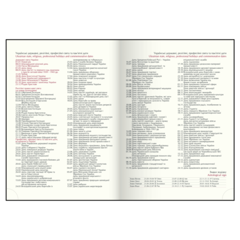 - На одній сторінці вертикально розміщено три/чотири дні тижня (субота і неділя - вертикальне розташування на одній частині), з організатором часу від 7:00 до 21:00, вказівкою місяця, року, дня тижня та дати, календар на поточний/наступний місяць, іменинники, знаки зодіаку, свята та пам'ятні дати