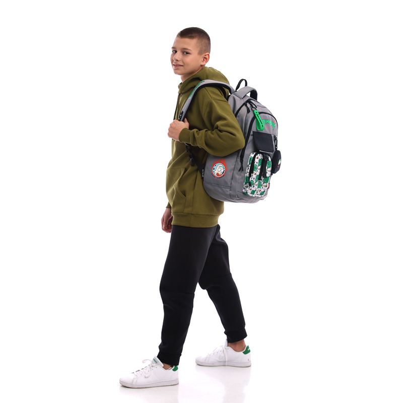 Рюкзак прикрашений об'ємним друком та малюнками, які світяться в темряві, а також резиновими бейджами і гаманцем на карабіні. У комплект входить резиновий брелок-підвіс з металевим карабіном.