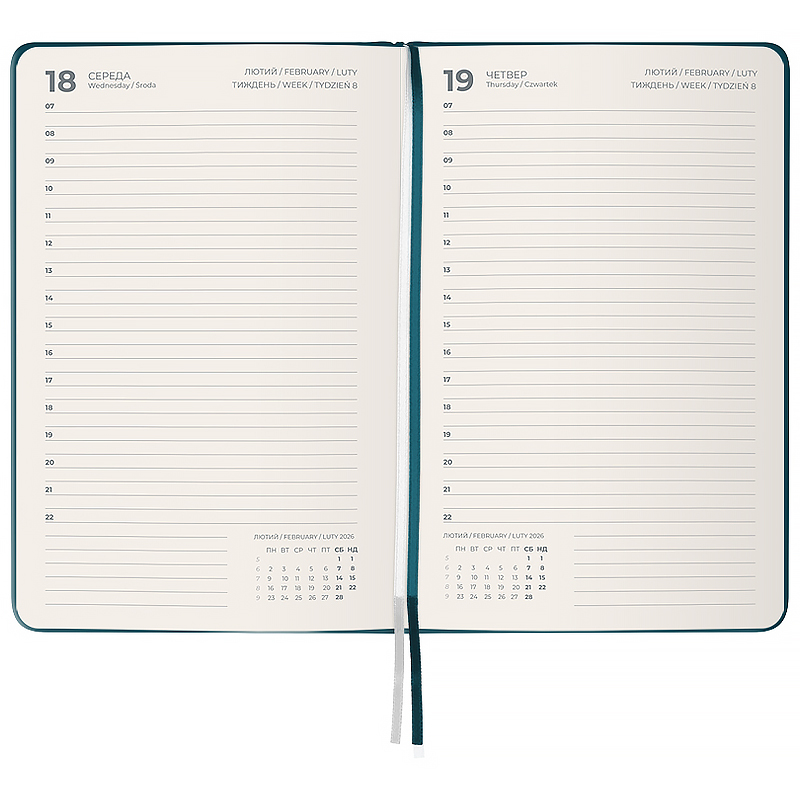 - Додаткові елементи: Дві різнокольорові закладки-ляссе, кишеня на форзаці