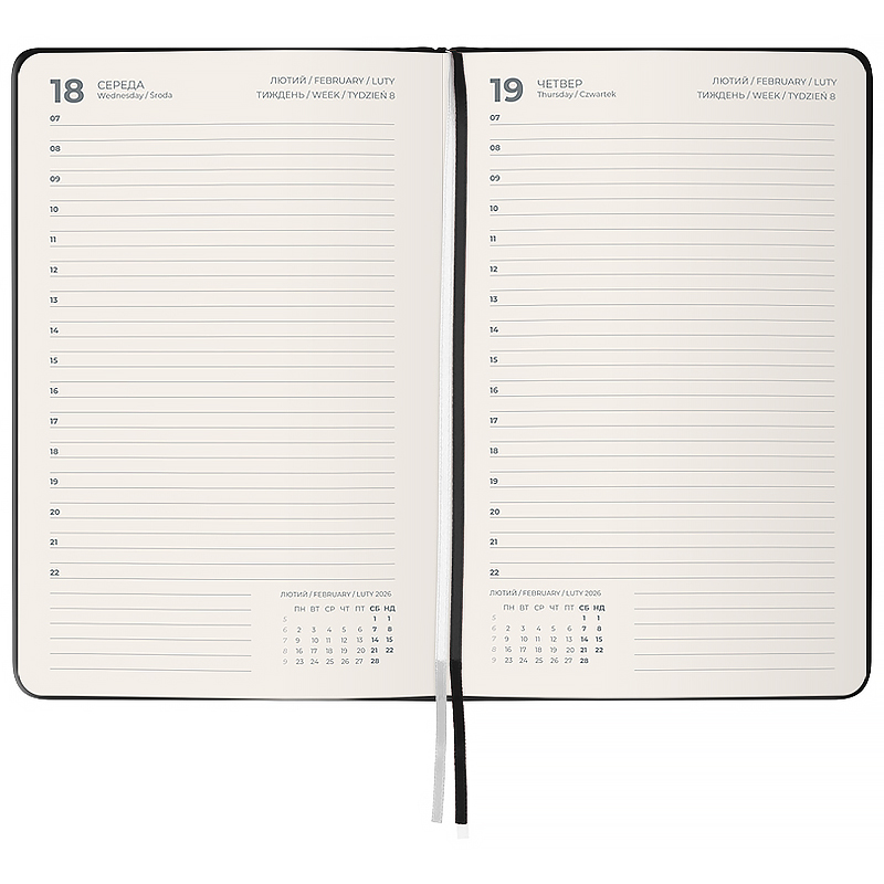 Щоденник має датований блок у лінію на кожен день, а також містить календар на 2026-2027 роки, загальний тижневий розклад, інформацію про свята, важливі номери телефонів, часові пояси країн світу та одиниці вимірювання.