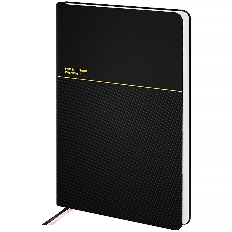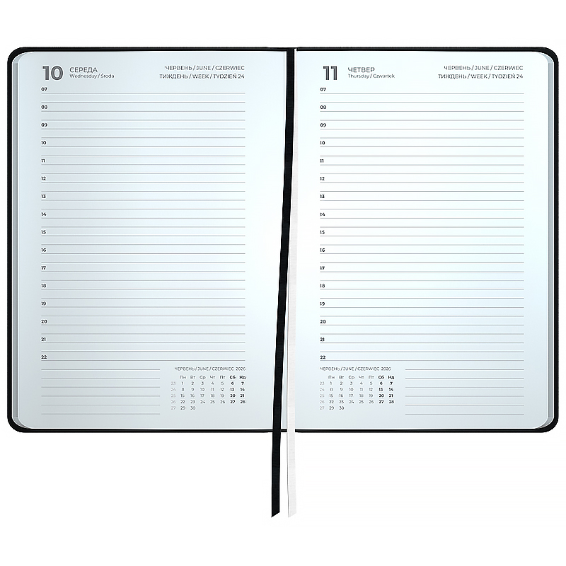 Дві різнокольорові закладки-ляссе дозволяють швидко знаходити та відкривати потрібні сторінки. Зверніть увагу, що в щоденнику немає кишені на форзаці, тасьми на обкладинці та петлі для ручки.