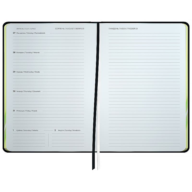 Дві різнокольорові закладки-ляссе дозволяють швидко знаходити та відкривати потрібні сторінки. Щоденник не містить кишені на форзаці, тесьми на обкладинці та петлі для ручки, що робить його легким та зручним у використанні.