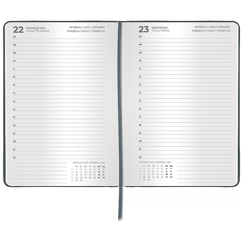Цей щоденник стане надійним супутником у плануванні вашого часу, дозволяючи зберігати акуратний та презентабельний вигляд протягом усього року.