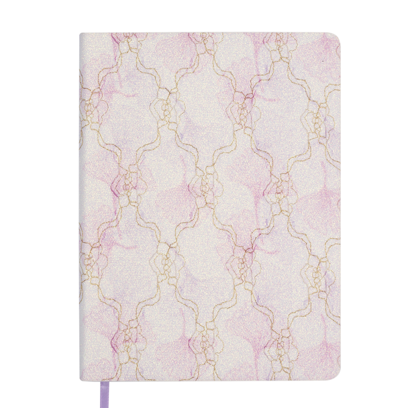 Гнучка обкладинка з штучної шкіри щоденника BLOOM має стильний та привабливий дизайнерський узор і фактурну поверхню з блискітками. Гармонійно доповнює дизайн тонований в чорний колір зріз внутрішнього блоку та нанесення року на ньому.