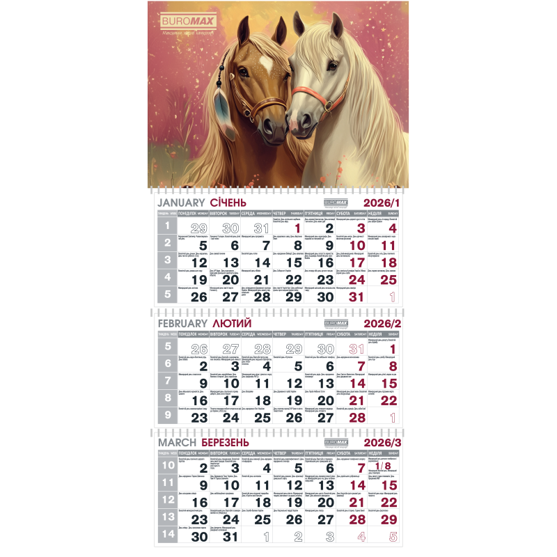 Календар настінний квартальний на 2026 р. (3 пружини) рік коня