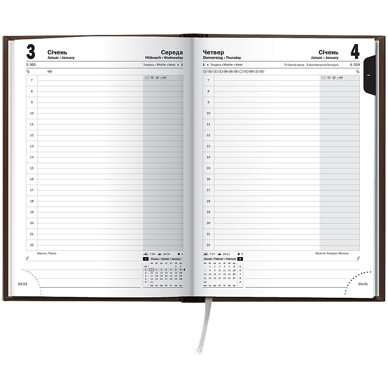 - Закладки: закладка-ляссе та відривні куточки з датою
