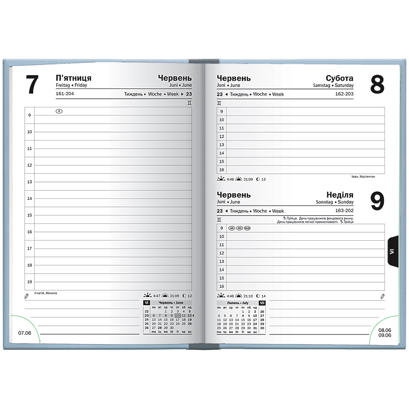 - Сторінки: 1 сторінка – 1 день; субота і неділя на одній сторінці