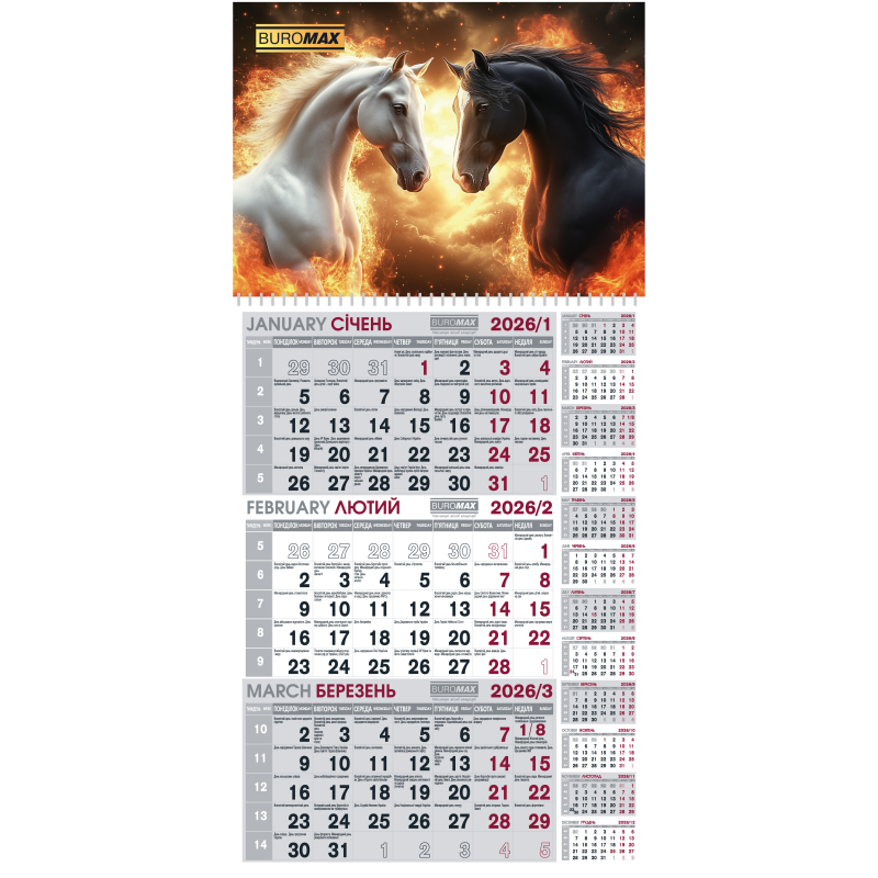 Календар BUROMAX на 2026 рік – незамінна річ, яка допоможе легко спланувати свій місяць, квартал і рік. Зручний настінний квартальний календар на одній білий пружині.