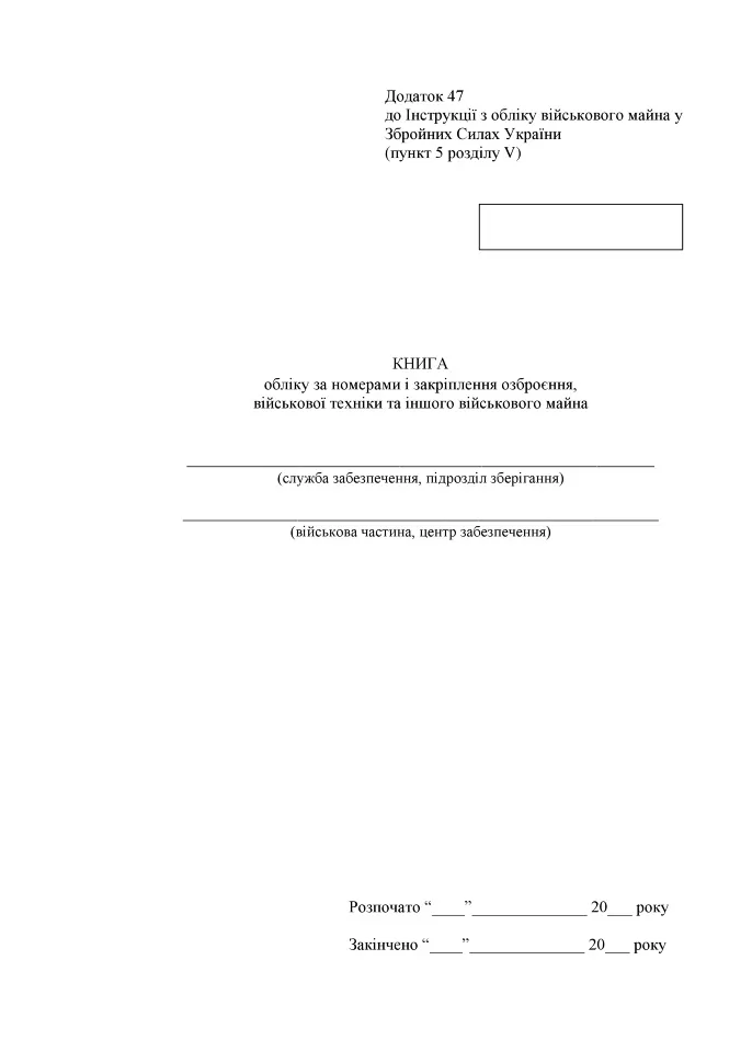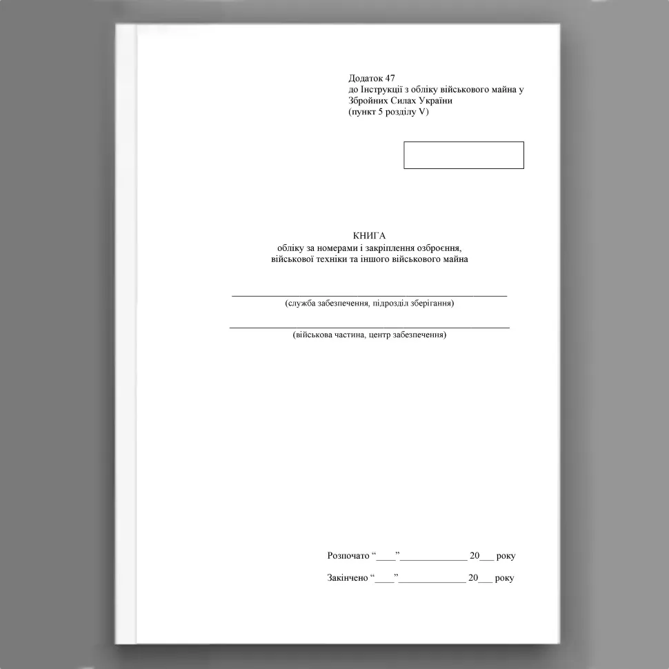 Книга обліку за номерами і закріплення озброєння військової техніки та іншого військового майна — це спеціалізований документ, призначений для обліку та контролю військового майна. Вона відповідає наказу Міністерства Оборони України № 440 від 17.08.2017.