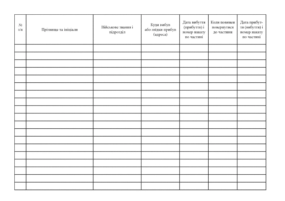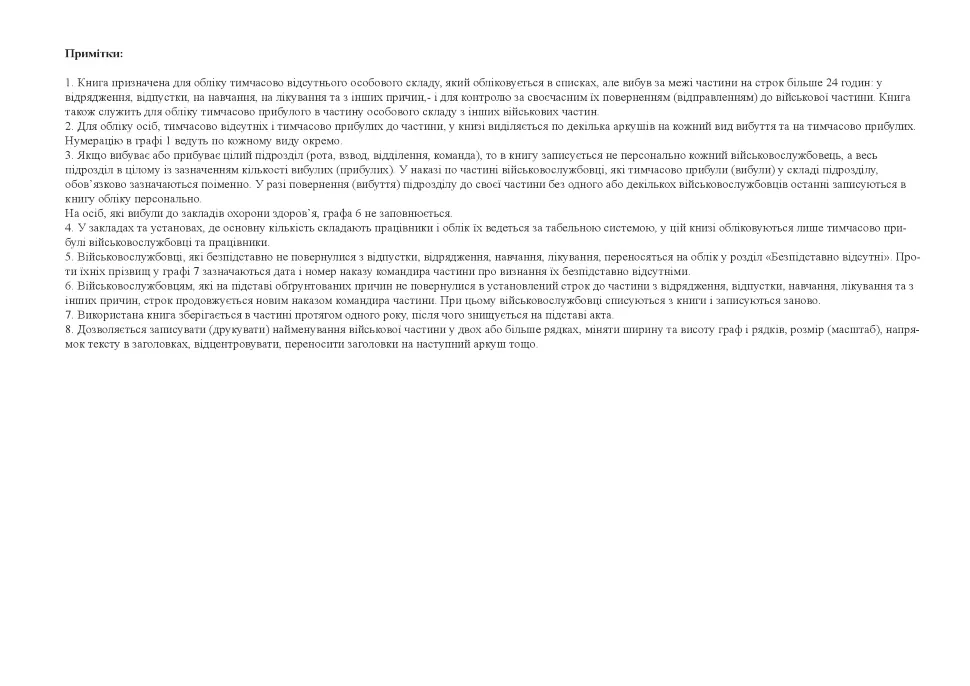 Книга обліку тимчасово відсутнього і тимчасово прибулого до військової частини особового складу призначена для ведення обліку військовослужбовців, які тимчасово відсутні або прибувають у військову частину.