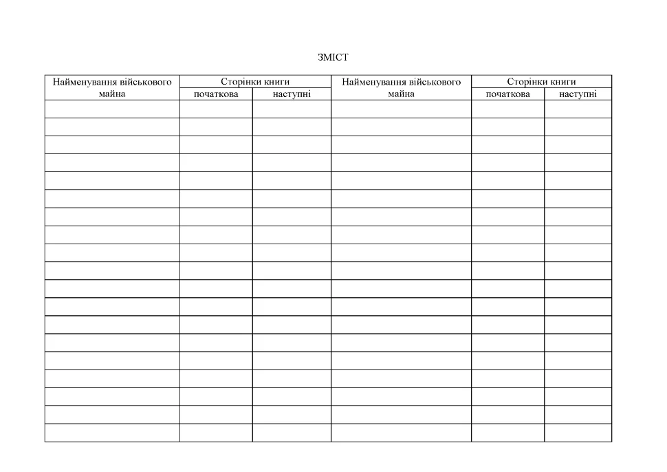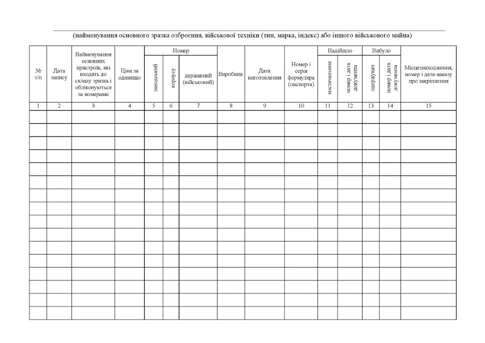 Книга обліку озброєння, військової техніки та іншого військового майна за номерами і технічним станом (далі – книга) призначена для систематизації інформації про озброєння та військову техніку. Вона розроблена відповідно до наказу Міністерства оборони України «Про затвердження Інструкції з обліку військового майна у Збройних Силах України» № 440 від 17.08.2017.