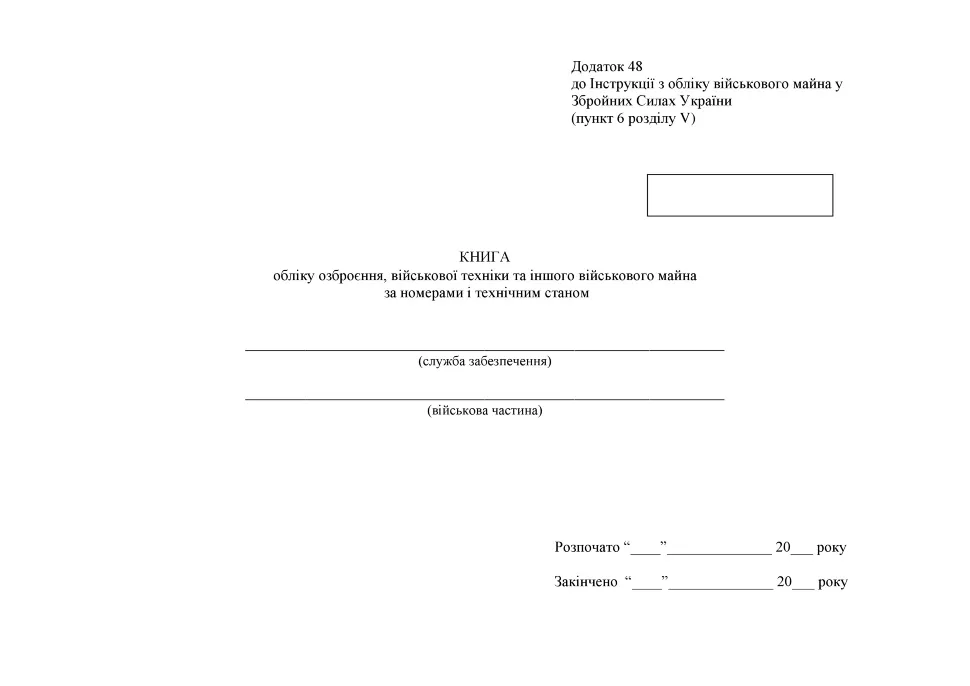 Книга обліку озброєння військової техніки та іншого військового майна за номерами і технічним станом, додаток 48, А4, 100арк, тверда палітурка