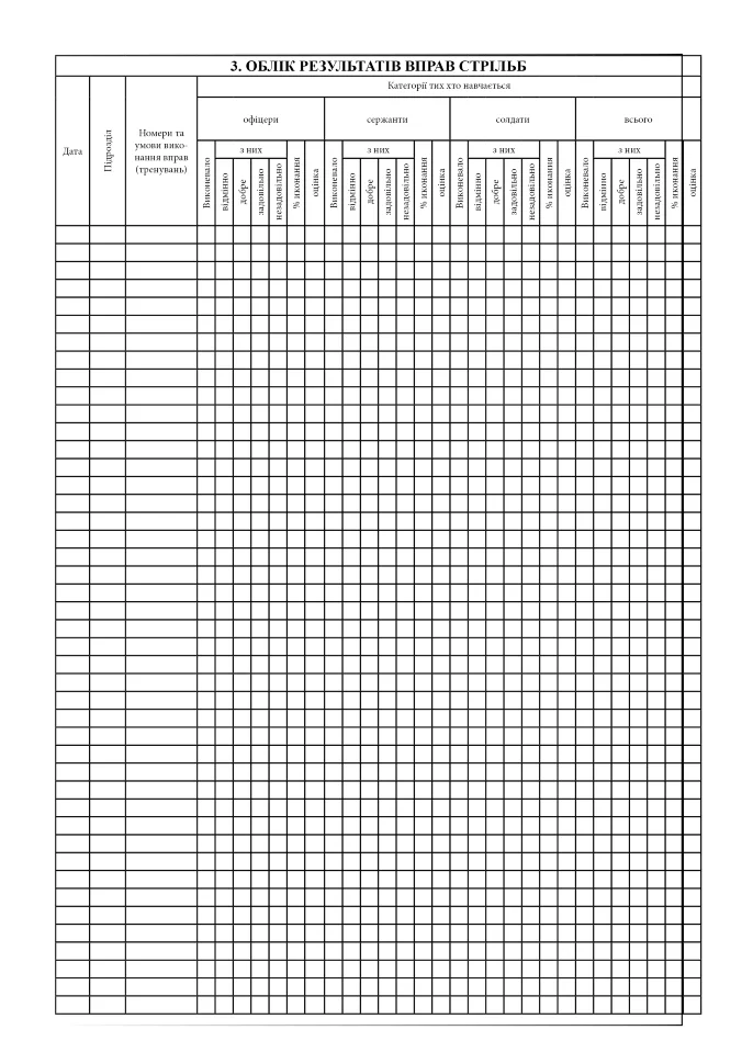 У розділі "Облік стажу практичного водіння машин" враховується практика водіння на всіх заняттях і навчаннях, а також під час перегонів. У розділі "Облік виконання норм та вимог ВСК" у графах "Результати виконання вправ" необхідно вказувати: у числі — результат, у знаменнику — дату, перед дробом — форму одягу; "С" — спортивна, "В" — військова.