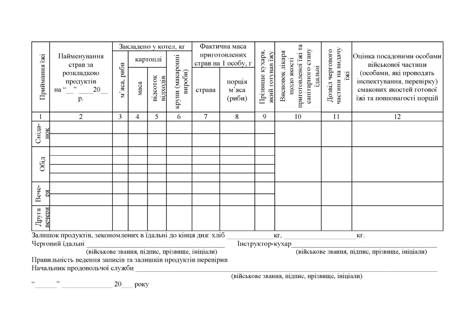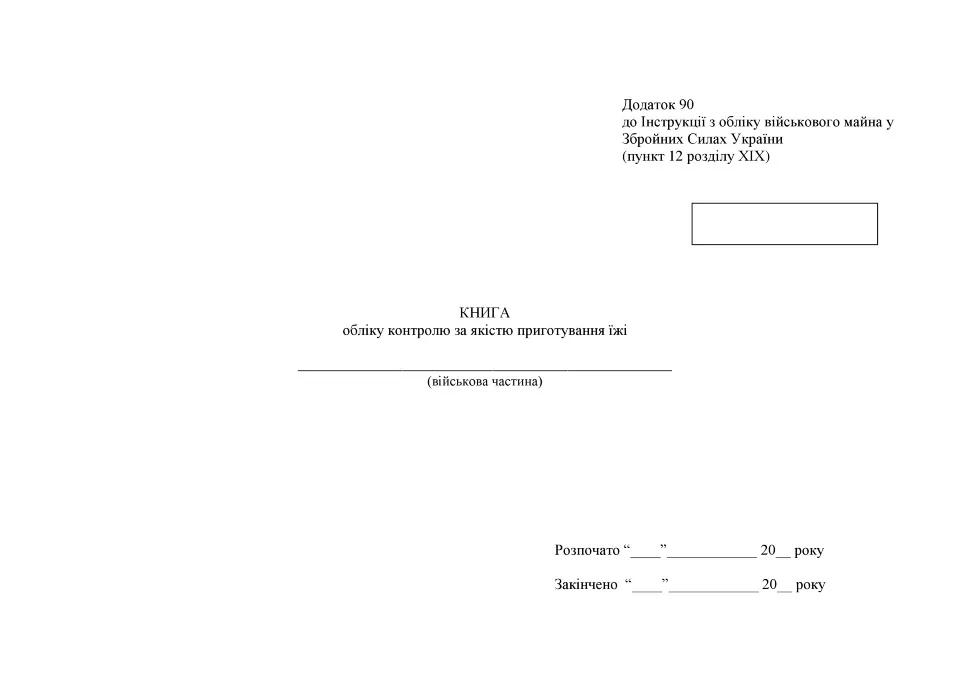 Дана книга призначена для обліку контролю за якістю приготування їжі, а також для ведення запису про санітарний стан їдальні (камбуза) і обліку зекономлених продуктів. Вона є обов'язковою відповідно до вказівки Міністерства оборони України.