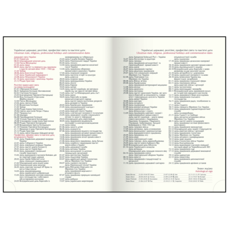 - Датированная страница на каждый день года с организатором времени от 7:00 до 21:00, календарем на текущий/следующий месяц, обозначением дня недели, знака зодиака, именинников