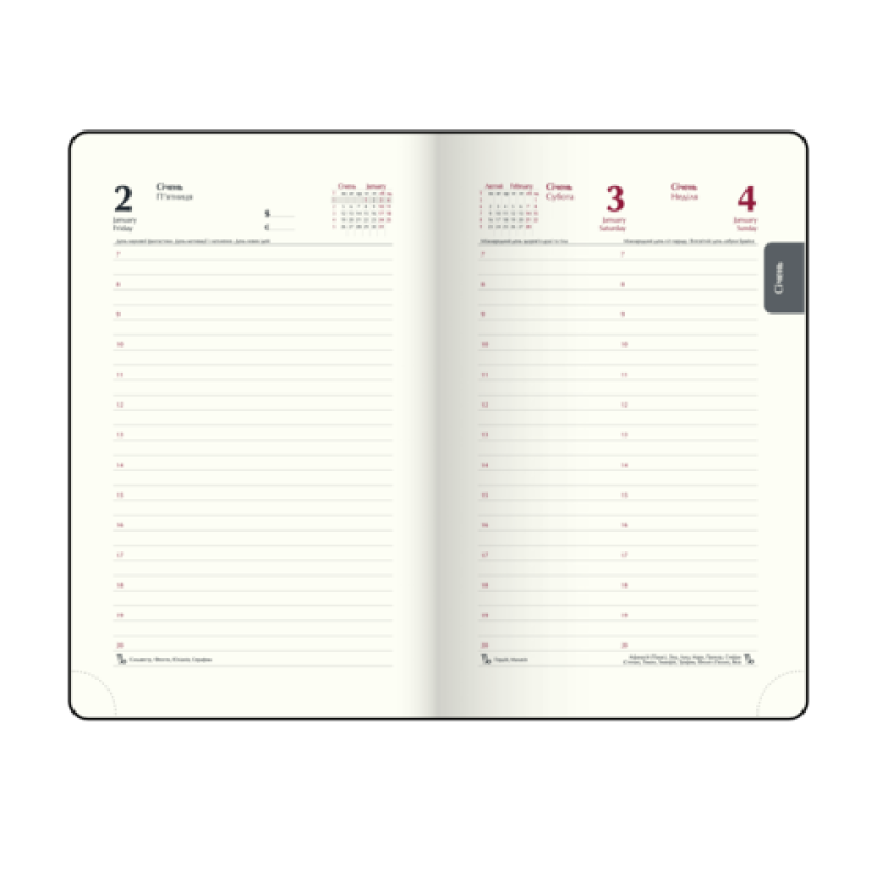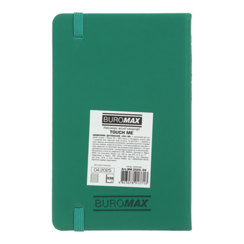 Ежедневники BUROMAX - это всегда широкий выбор самых разных обложек, фактур, цветов и форматов. Мы найдем подход к сердцу каждого покупателя! Стильный материал твердой обложки ежедневника TOUCH ME изготовлен из искусственной кожи с эффектом RUBBER TOUCH, который делает обложку очень нежной, мягкой, будто бархатистой, на ощупь. Отличным дополнением к дизайну является тиснение года на корешке и продольная резинка в цвет обложки, препятствующая открытию и повреждению внутреннего блока. Образ гармонично завершает срез, тонированный в цвет обложки. формат А6 336 страниц Внутренний блок: бумага офсетная кремового цвета плотностью 70 г/м² Закладка-ляссе в цвет обложки поможет быстро найти необходимую страницу Печать блока в 2 цвета: серый и бордовый Два языка блока: украинский, английский Индивидуальная упаковка: картонная коробка Структура внутреннего блока: Страница для внесения личной информации Календари на 2023 – 2026 годы Планинг на 2024 год Информационно-справочный блок: национальные, религиозные, профессиональные праздники и памятные даты, знаки зодиака, телефонные коды мобильных операторов и областных центров Украины, буквенные автомобильные коды стран, таблица расстояний между областными центрами Украины, справочник систем измерения, международные знаки соответствия, знаки ухода за одеждой Датированная страница на каждый день года с организатором времени от 7:00 до 21:00, календарем на текущий/следующий месяц, обозначением дня недели, знака зодиака, именинников Суббота и воскресенье - вертикальное размещение на одной странице Алфавитная книга для внесения контактов Ежедневник BUROMAX - незаменимый помощник в планировании Вашего рабочего дня, проверенный временем! На этой модели ежедневника возможно тиснение слепым методом и методом фольгирования.