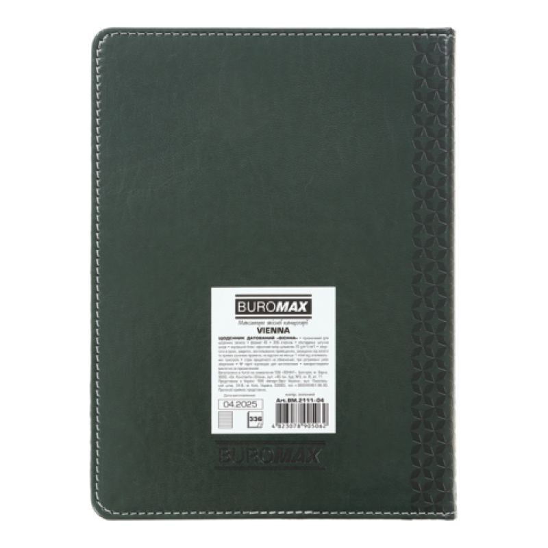 Ежедневники BUROMAX - это всегда широкий выбор самых разных обложек, фактур, цветов и форматов. Мы найдем подход к сердцу каждого покупателя! Твердая обложка ежедневника VIENNA изготовлена из искусственной кожи, с поролоном, слепым тиснением года на лицевой стороне и со вставкой с декоративным тиснением на корешке. Дополнительно декорирована швом по периметру и швом на стыке фактур. Ежедневник VIENNA станет незаменимым инструментом в организации Вашего рабочего времени. формат А5 336 страниц Внутренний блок: бумага офсетная кремового цвета плотностью 70 г/м² Закладка-ляссе в цвет обложки поможет быстро найти необходимую страницу Печать блока в 2 цвета: серый и бордовый Два языка блока: украинский, английский Карты Украины и Европы на форзацах Индивидуальная упаковка: картонная коробка Структура внутреннего блока: Страница для внесения личной информации Календари на 2023 – 2026 годы Планинг на 2024 год Информационно-справочный блок: национальные, религиозные, профессиональные праздники и памятные даты, знаки зодиака, телефонные коды мобильных операторов и областных центров Украины, буквенные автомобильные коды стран, таблица расстояний между областными центрами Украины, справочник систем измерения, международные знаки соответствия, знаки ухода за одеждой Датированная страница на каждый день года с организатором времени от 7:00 до 21:00, календарем на текущий/следующий месяц, обозначением дня недели, знака зодиака, именинников Суббота и воскресенье - вертикальное размещение на одной странице Алфавитная книга для внесения контактов Ежедневник BUROMAX формата А5 - это выбор, проверенный временем, самый популярный формат для незаменимого помощника в планировании Вашего рабочего дня. На данной модели ежедневника возможно тиснение как слепым методом, так и методом фольгирования.