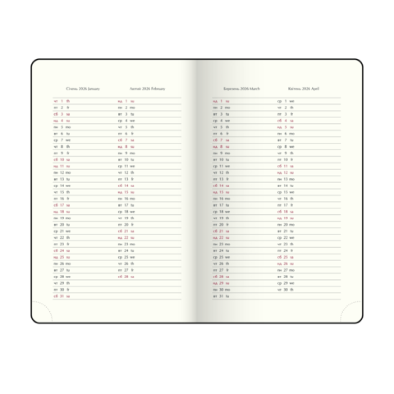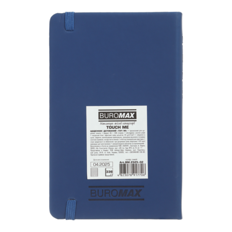 Ежедневники BUROMAX - это всегда широкий выбор самых разных обложек, фактур, цветов и форматов. Мы найдем подход к сердцу каждого покупателя! Стильный материал твердой обложки ежедневника TOUCH ME изготовлен из искусственной кожи с эффектом RUBBER TOUCH, который делает обложку очень нежной, мягкой, будто бархатистой, на ощупь. Отличным дополнением к дизайну является тиснение года на корешке и продольная резинка в цвет обложки, препятствующая открытию и повреждению внутреннего блока. Образ гармонично завершает срез, тонированный в цвет обложки. формат А6 336 страниц Внутренний блок: бумага офсетная кремового цвета плотностью 70 г/м² Закладка-ляссе в цвет обложки поможет быстро найти необходимую страницу Печать блока в 2 цвета: серый и бордовый Два языка блока: украинский, английский Индивидуальная упаковка: картонная коробка Структура внутреннего блока: Страница для внесения личной информации Календари на 2023 – 2026 годы Планинг на 2024 год Информационно-справочный блок: национальные, религиозные, профессиональные праздники и памятные даты, знаки зодиака, телефонные коды мобильных операторов и областных центров Украины, буквенные автомобильные коды стран, таблица расстояний между областными центрами Украины, справочник систем измерения, международные знаки соответствия, знаки ухода за одеждой Датированная страница на каждый день года с организатором времени от 7:00 до 21:00, календарем на текущий/следующий месяц, обозначением дня недели, знака зодиака, именинников Суббота и воскресенье - вертикальное размещение на одной странице Алфавитная книга для внесения контактов Ежедневник BUROMAX - незаменимый помощник в планировании Вашего рабочего дня, проверенный временем! На этой модели ежедневника возможно тиснение слепым методом и методом фольгирования.