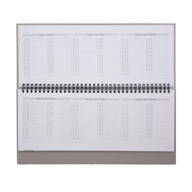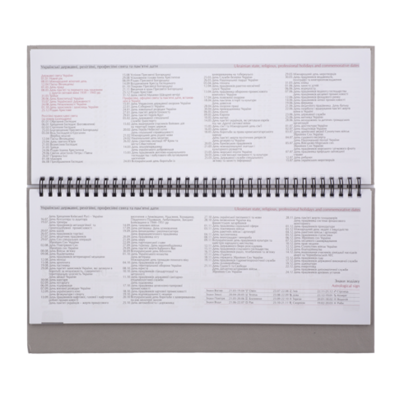 - Дві сторінки (розворот) містять вертикально розміщені 7 днів тижня (субота та неділя в одному стовпчику) з організатором часу від 7:00 до 20:00, календар на рік та на поточний місяць, знак зодіаку, іменинників, свята та пам'ятні дати на кожен день, а також вільне поле для нотаток