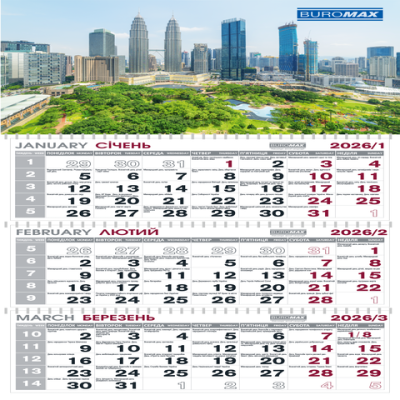 Календар настінний квартальний на 2026 р. (3 пружини) місто