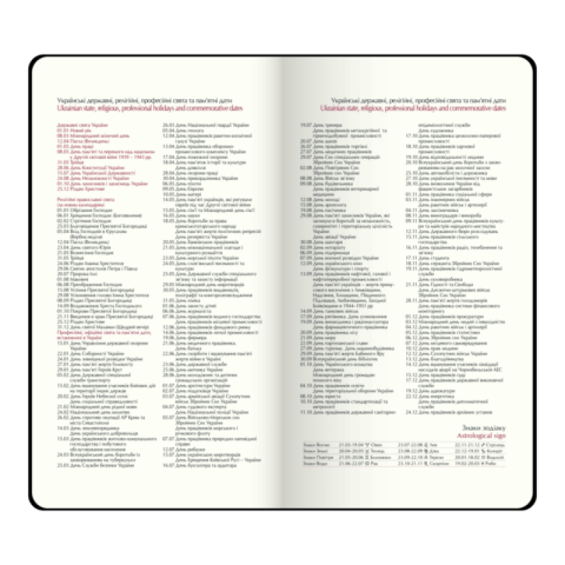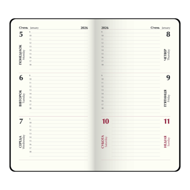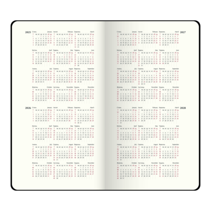 Еженедельники BUROMAX - это удобный аксессуар для еженедельного планирования своей деловой и личной деятельности. Гибкая обложка еженедельника SALERNO выполнена из гладкой искусственной кожи. Уникальной особенностью модели является металлический декор - шильда на лицевой стороне обложки. Дизайн гармонично дополняет слепое тиснение года на корешке, декоративный шов по периметру обложки и тонированный в цвет обложки срез внутреннего блока. Карманный размер еженедельника делает его постоянным спутником своего владельца, он не займет много места даже в маленькой сумке, поместится в карман и всегда будет под рукой. Размер 85х153 мм (карманный) 128 страниц Внутренний блок: офсетная бумага кремового цвета плотностью 70 г/м² Закладка-ляссе в цвет обложки Перфорированные уголки листов Печать блока в 2 цвета: серый и бордовый Два языка блока: украинский, английский Индивидуальная упаковка: картонная коробка Структура внутреннего блока: Страница для внесения личной информации Календари на 2024 – 2027 годы Информационно-справочный блок: национальные, религиозные, профессиональные праздники и памятные даты, знаки зодиака, телефонные коды мобильных операторов и областных центров Украины, буквенные автомобильные коды стран, таблица расстояний между областными центрами Украины, справочник систем измерения, международные знаки соответствия, знаки ухода за одеждой На одной странице горизонтально размещено три/четыре дня недели (суббота и воскресенье - вертикальное расположение на одной части), с организатором времени от 9:00 до 18:00, указанием месяца, года, дня недели и даты Алфавитная книга для внесения контактов Еженедельник BUROMAX – незаменимый помощник в планировании Вашего рабочего времени! На этой модели еженедельника возможно тиснение слепым методом и методом фольгирования.