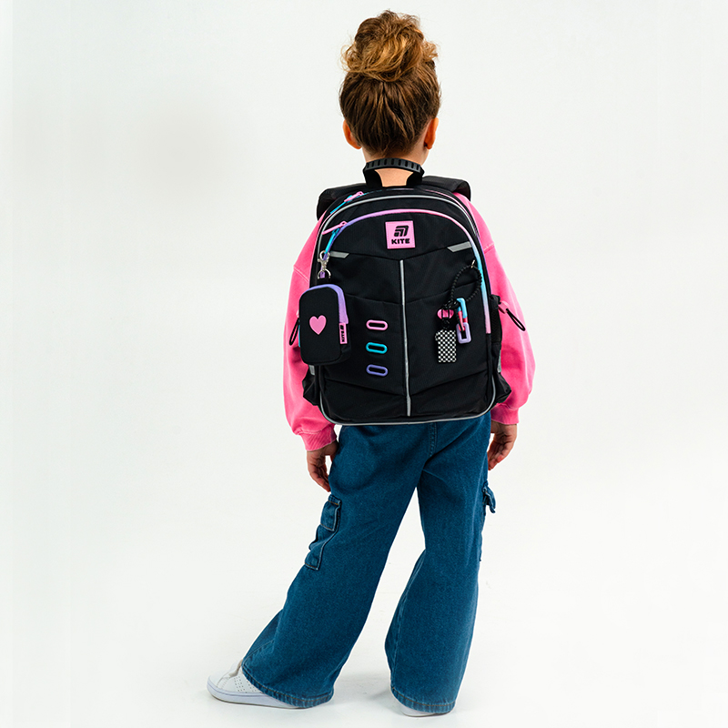 Рюкзак снаружи: запатентованная Ортопедическая спинка Ergo Kids; широкие лямки S-образной формы; 1 отделение; 1 просторный передний карман и 2 кармана на магнитах; 2 боковых кармана; светоотражающие элементы; ручка с резиновой вставкой; съемный нагрудный ремень; уплотненное дно с защитным покрытием; износостойкие молнии, надежная фурнитура; съемный кошелек на карабине. Рюкзак внутри: разделители с фиксирующей резинкой; карманы для планшета и телефона с плюшевой подкладкой; органайзер; съемная ключница; брендированная подкладка; поле для персональных данных; навигационные значки. Декор: цветные металлические люверсы, брелок-подвеска из комбинированных материалов