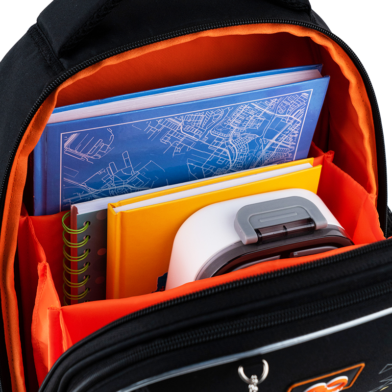 Рюкзак снаружи: запатентованная Ортопедическая спинка Ergo Kids; широкие лямки S-образной формы; 2 отделения; 2 боковых кармана; светоотражающие элементы; мягкая уплотненная ручка и текстильная петля; нагрудный ремень; уплотненное дно с ножками; износостойкие молнии, надежная фурнитура. Рюкзак внутри: разделители; органайзер. Декор: объемная печать, светоотражающая печать, объемная нашивка, резиновая подвеска