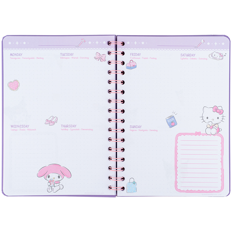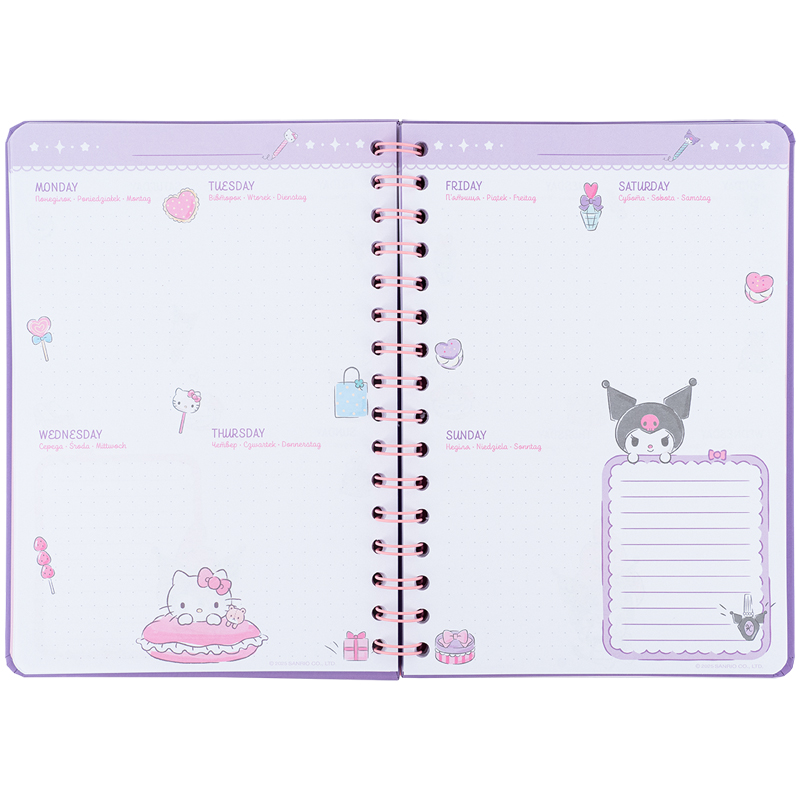Дневник-планер на спирали. Твердая картонная обложка с фиксирующей резинкой. Эффект на обложке: софт тач покрытие и тиснение фольгой. Внутри: • Расписание на неделю; • Неделя на двух страницах, 5 разных дизайнов разворотов недели; • 4 цветных развора в дизайн лицензии; • 2 страницы с стикерами; • Карман для хранения мелочей; Внутренний блок: английский, украинский, польский, немецкий. Формат А5, 138 стр., плотность листов 80г/м2.