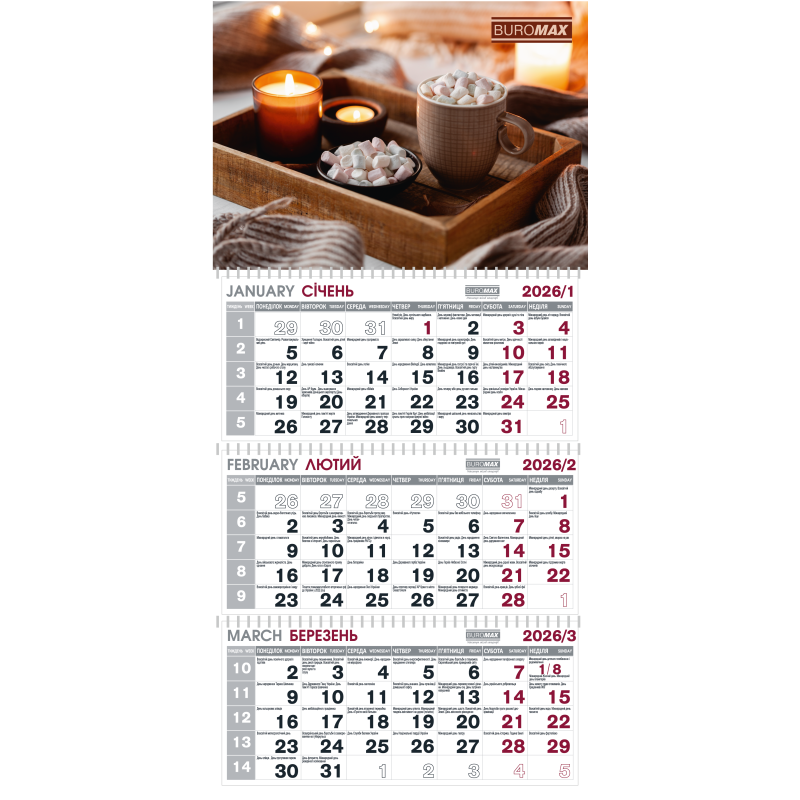 Календарь BUROMAX 2026 год - незаменимая вещь, которая поможет Вам легко спланировать свой месяц, квартал и год. Удобный настенный квартальный календарь на 3-х пружинах. Три блока, на каждом блоке один месяц, по 12 листов в каждом блоке Размер изделия: 298х648мм Размер постера: 298х210мм, изготовлен из целлюлозного картона 300 г/м². Размер блоков: 298х140мм, изготовлены из мелованной бумаги 90 г/м² Календарная сетка на двух языках: украинском, английском Комплектуется указателем даты и отверстием для крепления Дополнительная информация: церковные, государственные и профессиональные праздники, выходные дни