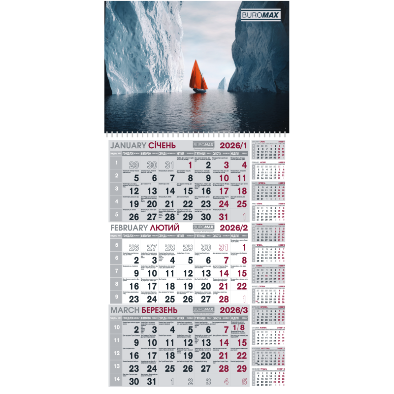 Календарь BUROMAX на 2026 год – незаменимая вещь, которая поможет легко спланировать свой месяц, квартал и год. Удобный настенный квартальный календарь на одной белой пружине. 12 отрывных листов из мелованной бумаги плотностью 90 г/м² размером 298х420 мм. На каждом листе три месяца подробно: текущий, предыдущий и следующий и небольшой календарь в год Размер изделия: 297х630 мм Размер постера: 297х210 мм, изготовлен из целлюлозного картона 300 г/м². Календарная сетка на двух языках: украинском, английском Комплектуется указателем даты и отверстием для крепления Дополнительная информация: церковные, государственные и профессиональные праздники, выходные дни