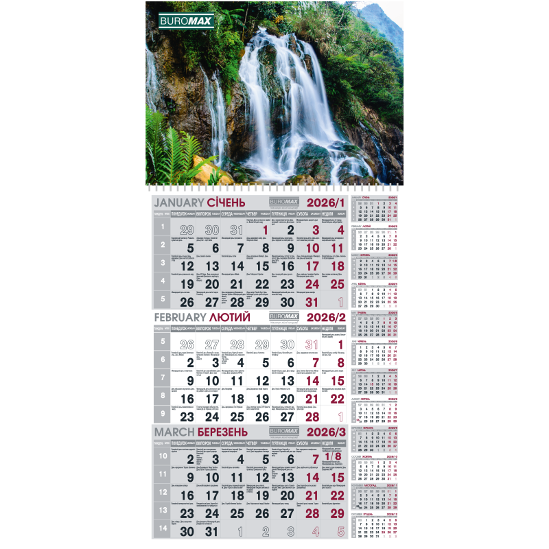 Календар настінний квартальний 2026 р., 297х630 мм, 1 пружина, водоспад