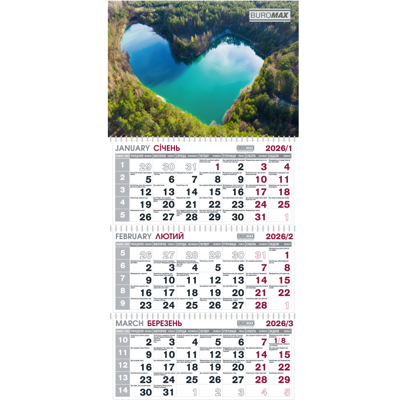 Календарь BUROMAX 2026 год - незаменимая вещь, которая поможет Вам легко спланировать свой месяц, квартал и год. Удобный настенный квартальный календарь на 3-х пружинах. Три блока, на каждом блоке один месяц, по 12 листов в каждом блоке Размер изделия: 298х648мм Размер постера: 298х210мм, изготовлен из целлюлозного картона 300 г/м². Размер блоков: 298х140мм, изготовлены из мелованной бумаги 90 г/м² Календарная сетка на двух языках: украинском, английском Комплектуется указателем даты и отверстием для крепления Дополнительная информация: церковные, государственные и профессиональные праздники, выходные дни