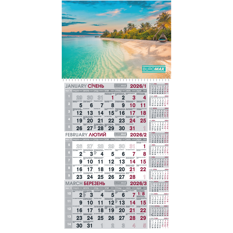 Календарь BUROMAX на 2026 год – незаменимая вещь, которая поможет легко спланировать свой месяц, квартал и год. Удобный настенный квартальный календарь на одной белой пружине. 12 отрывных листов из мелованной бумаги плотностью 90 г/м² размером 298х420 мм. На каждом листе три месяца подробно: текущий, предыдущий и следующий и небольшой календарь в год Размер изделия: 297х630 мм Размер постера: 297х210 мм, изготовлен из целлюлозного картона 300 г/м². Календарная сетка на двух языках: украинском, английском Комплектуется указателем даты и отверстием для крепления Дополнительная информация: церковные, государственные и профессиональные праздники, выходные дни