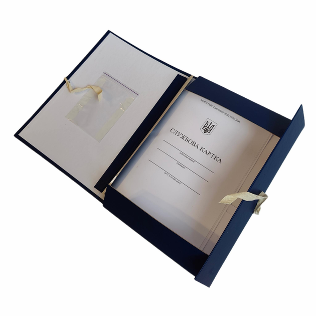 Папка "Особова справа, Міністерство оборони України" виготовляється відповідно до Наказу Міністерства оборони України від 15.09.2022 № 280 "Про затвердження Інструкції з організації обліку особового складу в системі Міністерства оборони України" зі змінами від 14.10.2024 р., розділ III, пункти 13 і 29, та Технічною специфікацією Міністерства оборони України ТС А01XJ.10894-477:2023 (01) зі зміною №1 від 26.04.2024 р. Виробляється на автоматичній лінії Horauf (Німеччина) зі щільного палітурного картону 1,8-2 мм. Бумвініл, колір синій, на 2-х зав'язках. Написи на обкладинці папки виконано тисненням "під золото". На лівому форзаці обкладинки - прозора кишеня для фотографії 95х125 мм. На правому форзаці обкладинки приклеєно кишеню з крафт-паперу 220х100 мм. Внутрішній блок складається з чотирьох аркушів формату А4, між якими розміщено три корінці з палітурного коленкору для підшивання документів, які кріпляться до обкладинки трьома скобами. Блок складається з таких сторінок: послужний список, автобіографія та атестаційний матеріал; опис документів особової справи; додаткові матеріали.