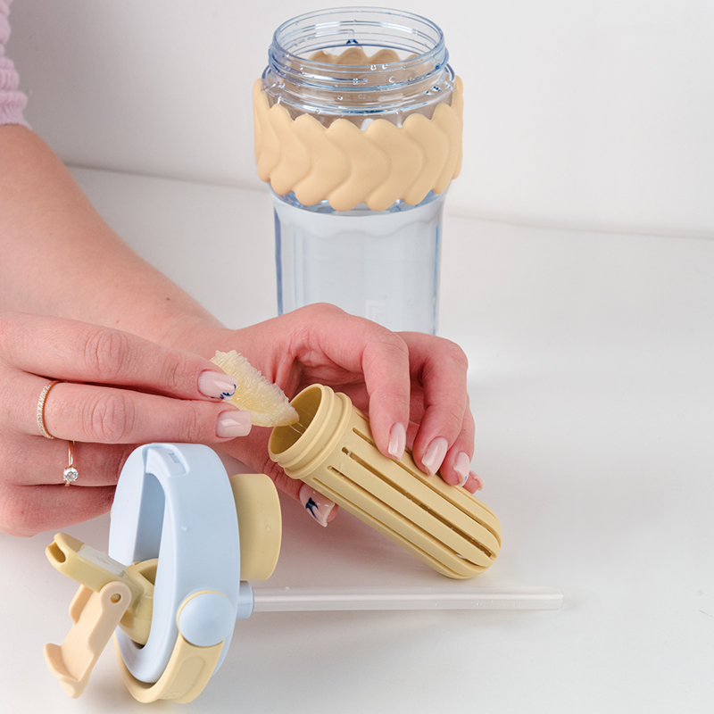 Стакан для воды изготовлен из безопасного тритана – материала, который не содержит вредных веществ и не впитывает запахов. Особенности: • тритан – безопасный, легкий, не впитывающий запахи; • съемная вставка – для льда, ягод или кусочков фруктов; • способ питья – трубочка; • силиконовое рельефное кольцо – стакан не скользит в руке; • компактная форма – и вместительный объем 900 мл; • удобная ручка – легко носить в руках.