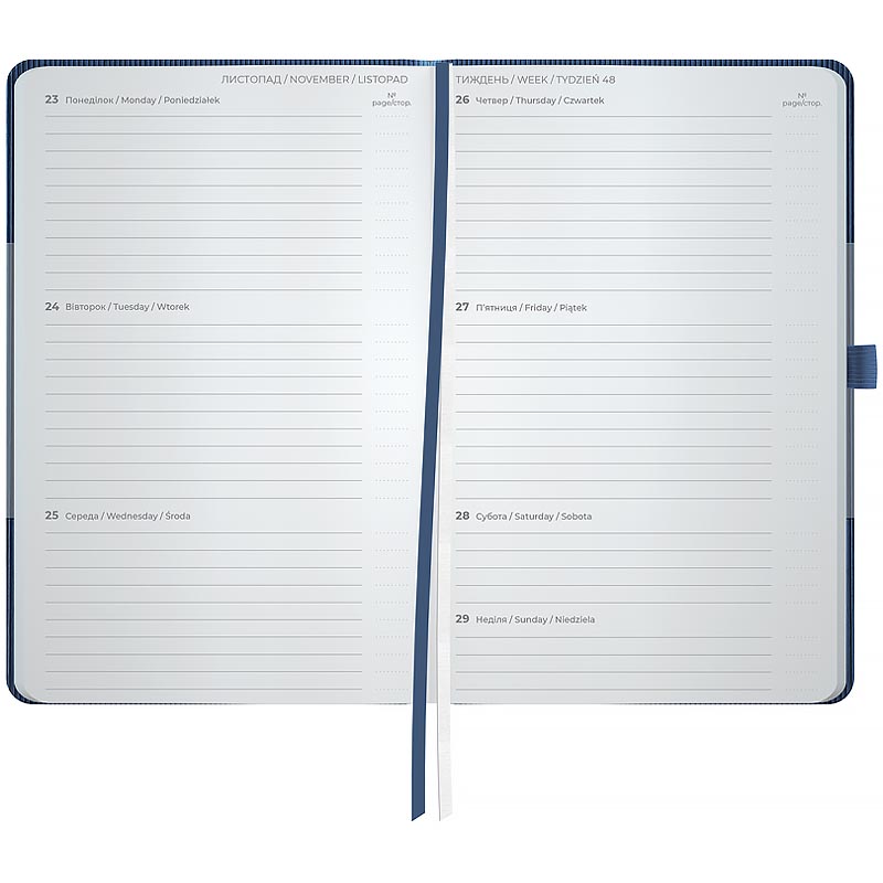 Еженедельник Axent формата А5- из серии Lines с твердой обложкой. Используется для каждодневных записей, а также деловых и творческих задач. Твердый переплет из PU-материала помогает сохранить аккуратный и презентабельный вид на протяжении долгого времени. Качественная кремовая бумага плотностью 80 г/м2 хорошо впитывает чернила и обеспечивает комфортное письмо. Удобно делать записи, чертить и рисовать. Еженедельник поделён на 2 части – датированный блок в линейку для удобного планирования дел и дополнительные листы в клетку для ведения личных записей. Внутренний блок на украинском языке. Планировщик содержит календарь на 2026-2027 год, общее расписание недели, поля для записи любимых книг, трекер полезных привычек, информацию о праздниках, важных телефонных номерах, часовых поясах стран мира, единицах измерения, шкале температур. Две разноцветные закладки-ляссе позволяют быстро найти и открыть нужные страницы. Эластичная резинка предотвращает произвольное открывание. Содержит 96 листов, размер - 125*195 мм