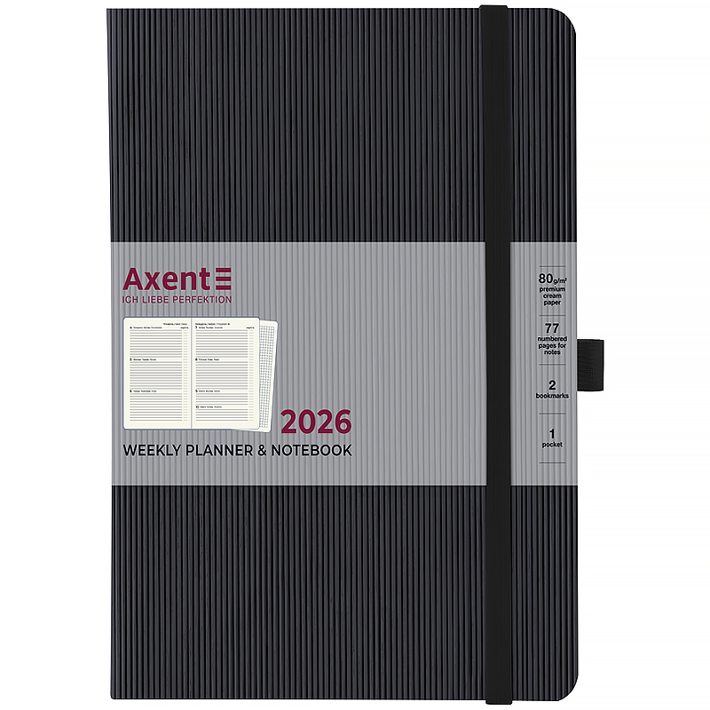 Еженедельник Axent формата А5- из серии Lines с твердой обложкой. Используется для каждодневных записей, а также деловых и творческих задач. Твердый переплет из PU-материала помогает сохранить аккуратный и презентабельный вид на протяжении долгого времени. Качественная кремовая бумага плотностью 80 г/м2 хорошо впитывает чернила и обеспечивает комфортное письмо. Удобно делать записи, чертить и рисовать. Еженедельник поделён на 2 части – датированный блок в линейку для удобного планирования дел и дополнительные листы в клетку для ведения личных записей. Внутренний блок на украинском языке. Планировщик содержит календарь на 2026-2027 год, общее расписание недели, поля для записи любимых книг, трекер полезных привычек, информацию о праздниках, важных телефонных номерах, часовых поясах стран мира, единицах измерения, шкале температур. Две разноцветные закладки-ляссе позволяют быстро найти и открыть нужные страницы. Эластичная резинка предотвращает произвольное открывание. Содержит 96 листов, размер - 125*195 мм