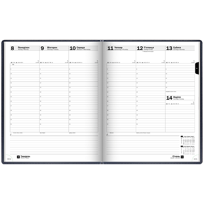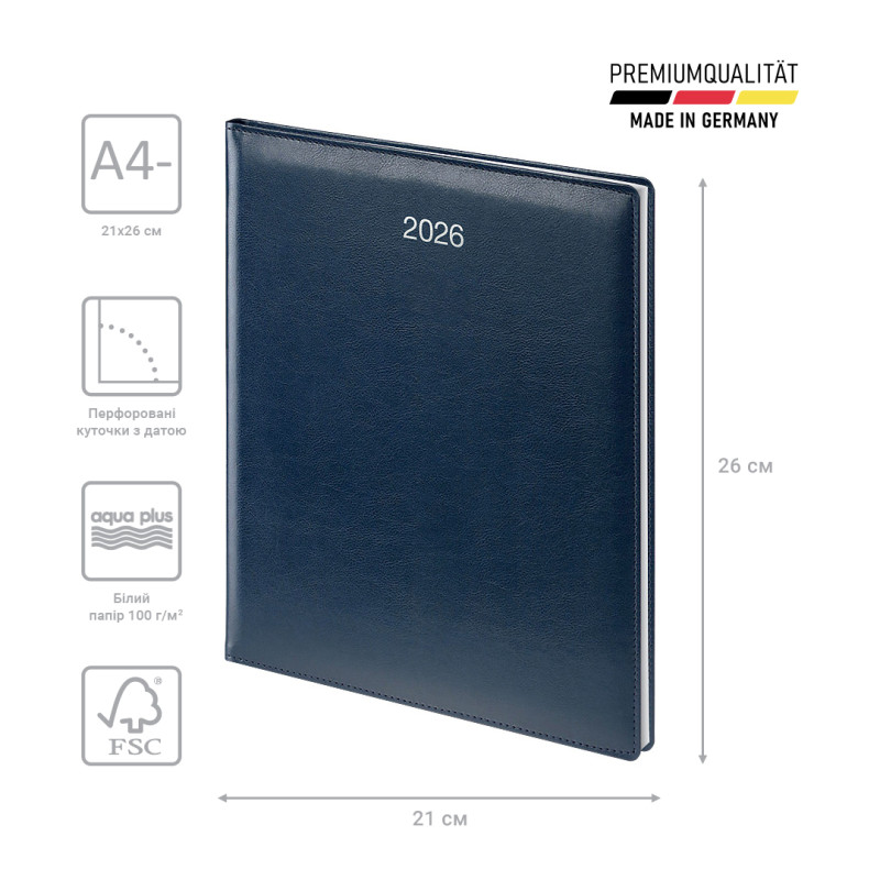 Еженедельник Brunnen 2026 Бюро – статусная модель для тех, кому важно детальное планирование дел. Особенности: Три языка: украинский, английский, немецкий. Формат А4 с разворотом недели. Две страницы – одна неделя. Общее количество страниц – 152. Европейская белая бумага 100 г/м2. Страницы общего планирования на год. Информационный блок. Алфавитная записная книжка. Органайзер времени с 09:00 до 21:00. Изысканные кремовые форзацы. Печать серого цвета. Дополнительные страницы с перфорацией. Отрывные датированные уголки и закладка-ляссе. Эффектная синяя обложка Soft с лаконичным серебряным тиснением.