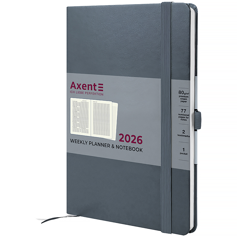 Удобный еженедельник Axent из серии Strong в твердой обложке. Используется для каждодневных записей, а также деловых и творческих задач. Твердая обложка из винила помогает сохранить аккуратный и презентабельный вид на протяжении долгого времени. Качественная кремовая бумага плотностью 80 г/м2 хорошо впитывает чернила и обеспечивает комфортное письмо. Удобно делать записи, чертить и рисовать. Еженедельник поделен на 2 части – датированный блок в линию для удобного планирования дел и дополнительные листы в линию для ведения личных записей. Внутренний блок на украинском языке. Блокнот содержит календарь на 2026-2027 год, общее расписание недели, поля для записи любимых книг, трекер полезных привычек, информацию о праздниках, важных телефонных номерах, часовых поясах стран мира, единицах измерения, шкале температур. Две разноцветные закладки-ляссе позволяют быстро найти и открыть нужные страницы. Содержит 96 листов, размер - 145*210 мм.