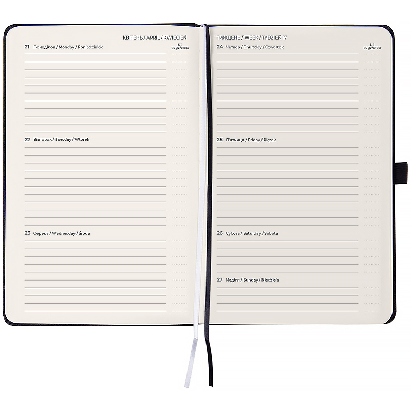 Еженедельник Axent формата А5- из серии Strong с твердой обложкой. Используется для каждодневных записей, а также деловых и творческих задач. Твердый переплет из винила помогает сохранить аккуратный и презентабельный вид на протяжении долгого времени. Качественная кремовая бумага плотностью 80 г/м2 хорошо впитывает чернила и обеспечивает комфортное письмо. Удобно делать записи, чертить и рисовать. Еженедельник поделён на 2 части – датированный блок в линейку для удобного планирования дел и дополнительные листы в клетку для ведения личных записей. Внутренний блок на украинском языке. Планировщик содержит календарь на 2026-2027 год, общее расписание недели, поля для записи любимых книг, трекер полезных привычек, информацию о праздниках, важных телефонных номерах, часовых поясах стран мира, единицах измерения, шкале температур. Две разноцветные закладки-ляссе позволяют быстро найти и открыть нужные страницы. Эластичная резинка предотвращает произвольное открывание. Содержит 96 листов, размер - 125*195 мм.