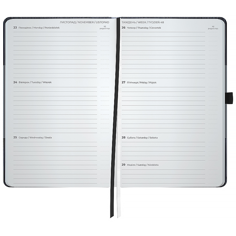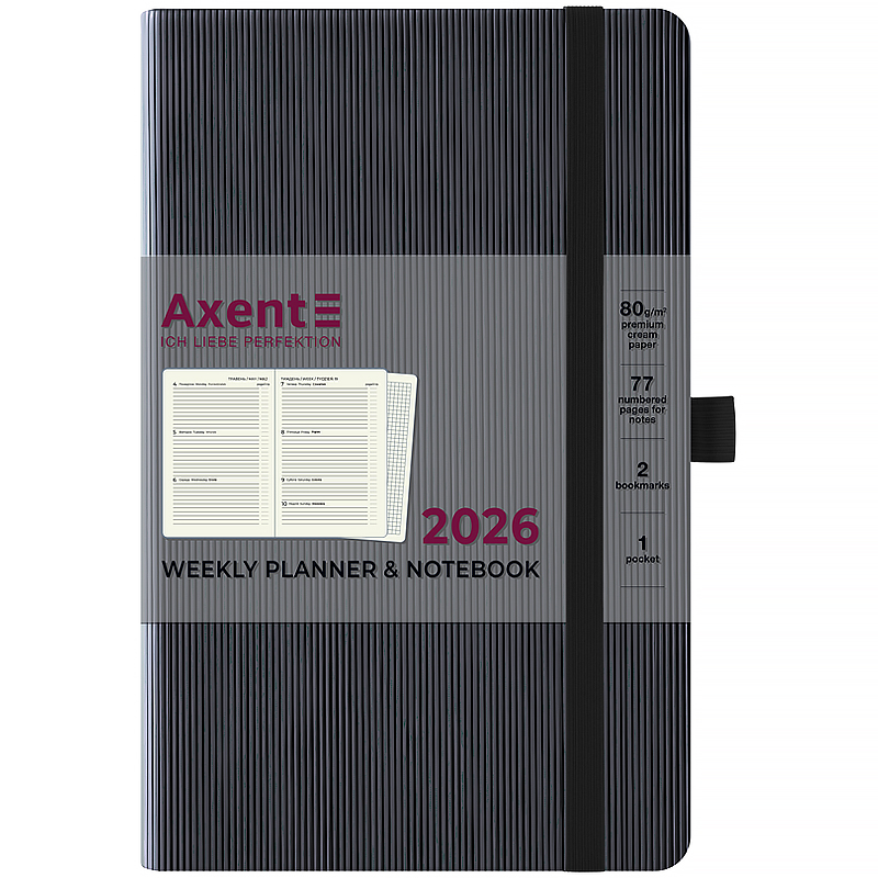 Еженедельник Axent формата А5- из серии Lines с твердой обложкой. Используется для каждодневных записей, а также деловых и творческих задач. Твердый переплет из PU-материала помогает сохранить аккуратный и презентабельный вид на протяжении долгого времени. Качественная кремовая бумага плотностью 80 г/м2 хорошо впитывает чернила и обеспечивает комфортное письмо. Удобно делать записи, чертить и рисовать. Еженедельник поделён на 2 части – датированный блок в линейку для удобного планирования дел и дополнительные листы в клетку для ведения личных записей. Внутренний блок на украинском языке. Планировщик содержит календарь на 2026-2027 год, общее расписание недели, поля для записи любимых книг, трекер полезных привычек, информацию о праздниках, важных телефонных номерах, часовых поясах стран мира, единицах измерения, шкале температур. Две разноцветные закладки-ляссе позволяют быстро найти и открыть нужные страницы. Эластичная резинка предотвращает произвольное открывание. Содержит 96 листов, размер - 125*195 мм