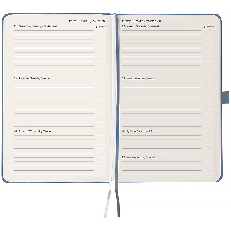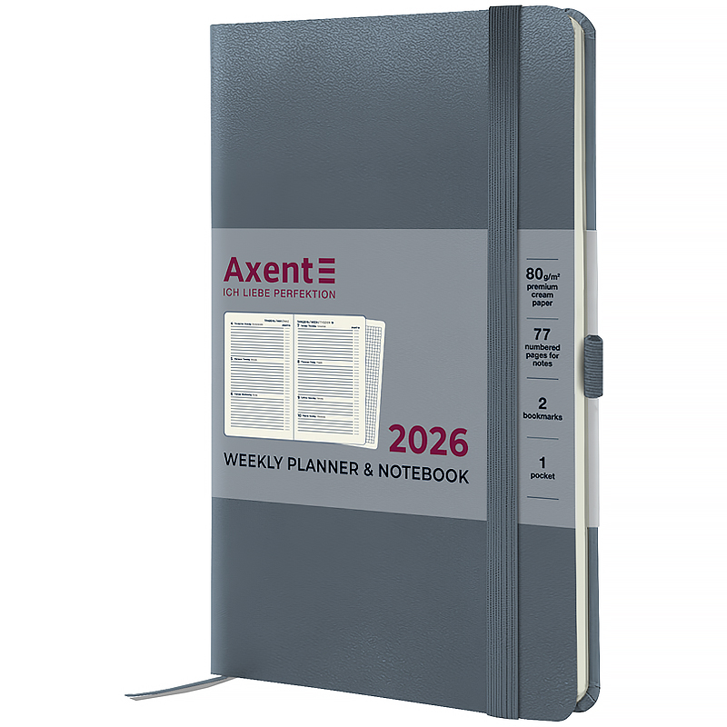 Еженедельник Axent формата А5- из серии Strong с твердой обложкой. Используется для каждодневных записей, а также деловых и творческих задач. Твердый переплет из винила помогает сохранить аккуратный и презентабельный вид на протяжении долгого времени. Качественная кремовая бумага плотностью 80 г/м2 хорошо впитывает чернила и обеспечивает комфортное письмо. Удобно делать записи, чертить и рисовать. Еженедельник поделён на 2 части – датированный блок в линейку для удобного планирования дел и дополнительные листы в клетку для ведения личных записей. Внутренний блок на украинском языке. Планировщик содержит календарь на 2026-2027 год, общее расписание недели, поля для записи любимых книг, трекер полезных привычек, информацию о праздниках, важных телефонных номерах, часовых поясах стран мира, единицах измерения, шкале температур. Две разноцветные закладки-ляссе позволяют быстро найти и открыть нужные страницы. Эластичная резинка предотвращает произвольное открывание. Содержит 96 листов, размер - 125*195 мм.