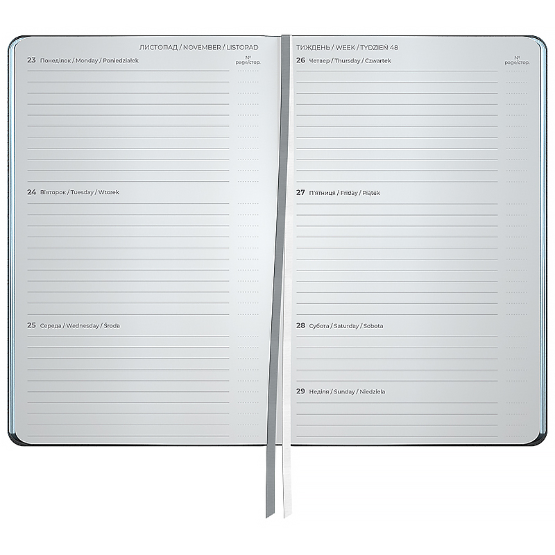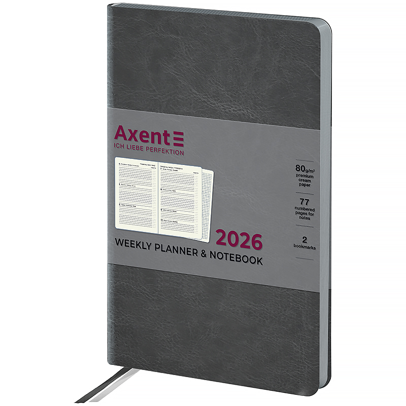 Еженедельник Axent формата А5- из серии City с мягкой обложкой и серебряным срезом. Используется для каждодневных записей, а также деловых и творческих задач. Мягкий переплет из PU-материала помогает сохранить аккуратный и презентабельный вид на протяжении долгого времени. Качественная кремовая бумага плотностью 80 г/м2 хорошо впитывает чернила и обеспечивает комфортное письмо. Удобно делать записи, чертить и рисовать. Еженедельник поделён на 2 части – датированный блок в линейку для удобного планирования дел и дополнительные листы в клетку для ведения личных записей. Внутренний блок на украинском языке. Планировщик содержит календарь на 2026-2027 год, общее расписание недели, поля для записи любимых книг, трекер полезных привычек, информацию о праздниках, важных телефонных номерах, часовых поясах стран мира, единицах измерения, шкале температур. Две разноцветные закладки-ляссе позволяют быстро найти и открыть нужные страницы. Содержит 96 листов. Кармана на форзаце нет.