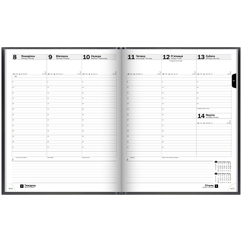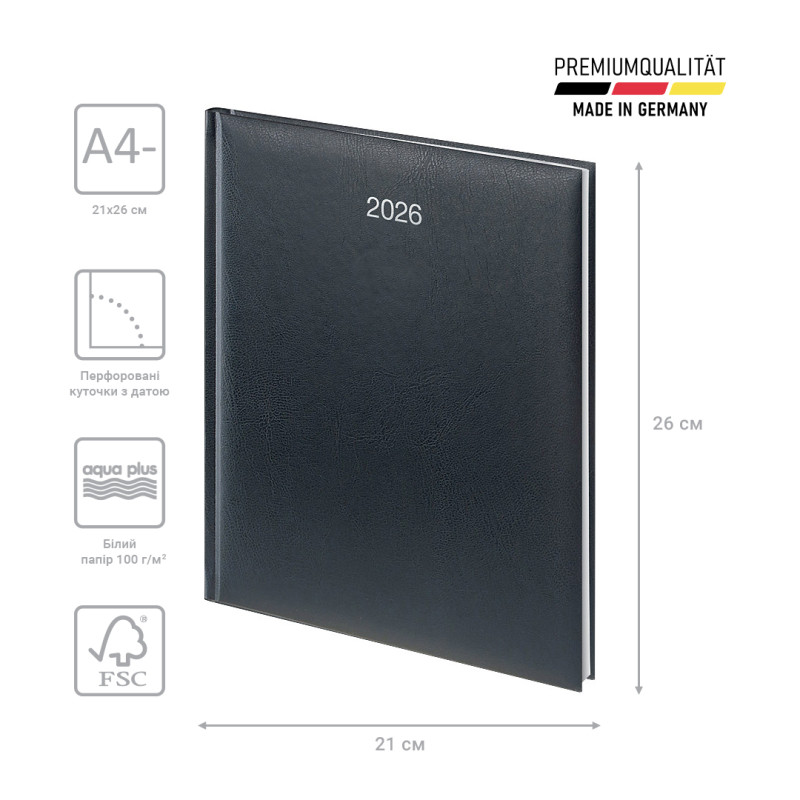 Еженедельник Brunnen 2026 Бюро – статусная модель для тех, кому важно детальное планирование дел. Особенности: Три языка: украинский, английский, немецкий. Формат А4 с разворотом недели. Две страницы – одна неделя. Общее количество страниц – 152. Европейская белая бумага 100 г/м2. Страницы общего планирования на год. Информационный блок. Алфавитная записная книжка. Органайзер времени с 09:00 до 21:00. Изысканные кремовые форзацы. Печать серого цвета. Дополнительные страницы с перфорацией. Отрывные датированные уголки и закладка-ляссе. Эффектная черная обложка Miradur с лаконичным серебряным тиснением.