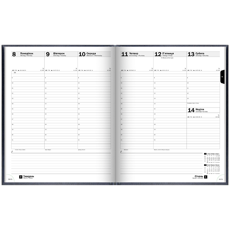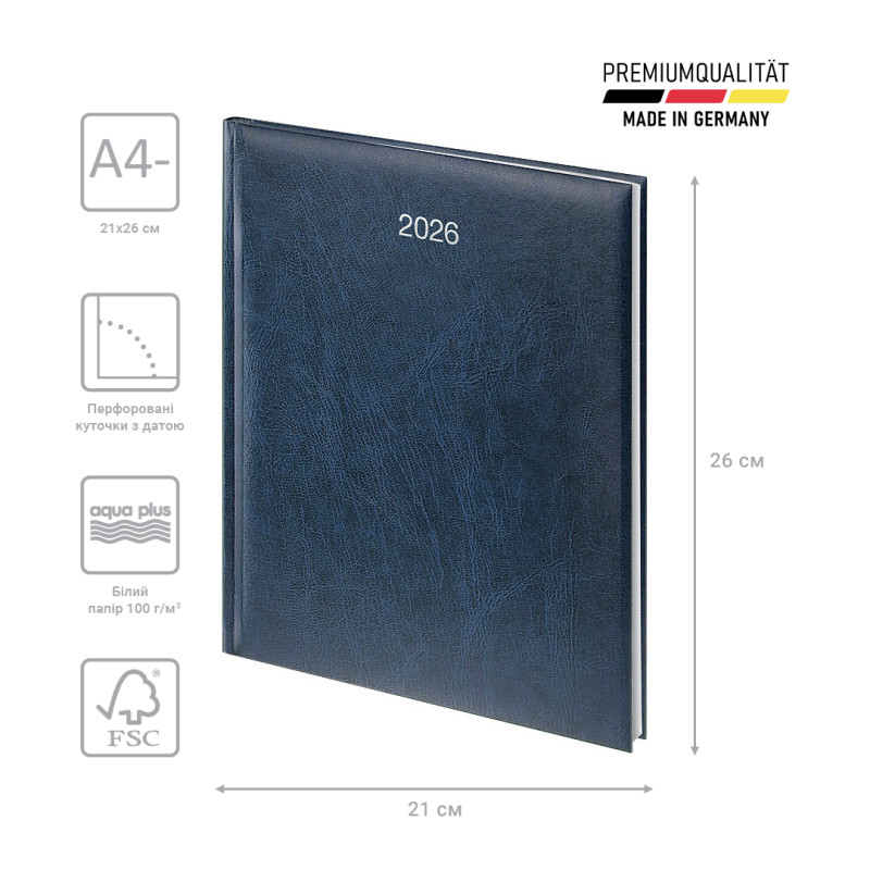 Еженедельник Brunnen 2026 Бюро – статусная модель для тех, кому важно детальное планирование дел. Особенности: Три языка: украинский, английский, немецкий. Формат А4 с разворотом недели. Две страницы – одна неделя. Общее количество страниц – 152. Европейская белая бумага 100 г/м2. Страницы общего планирования на год. Информационный блок. Алфавитная записная книжка. Органайзер времени с 09:00 до 21:00. Изысканные кремовые форзацы. Печать серого цвета. Дополнительные страницы с перфорацией. Отрывные датированные уголки и закладка-ляссе. Эффектная синяя обложка Miradur с лаконичным серебряным тиснением.