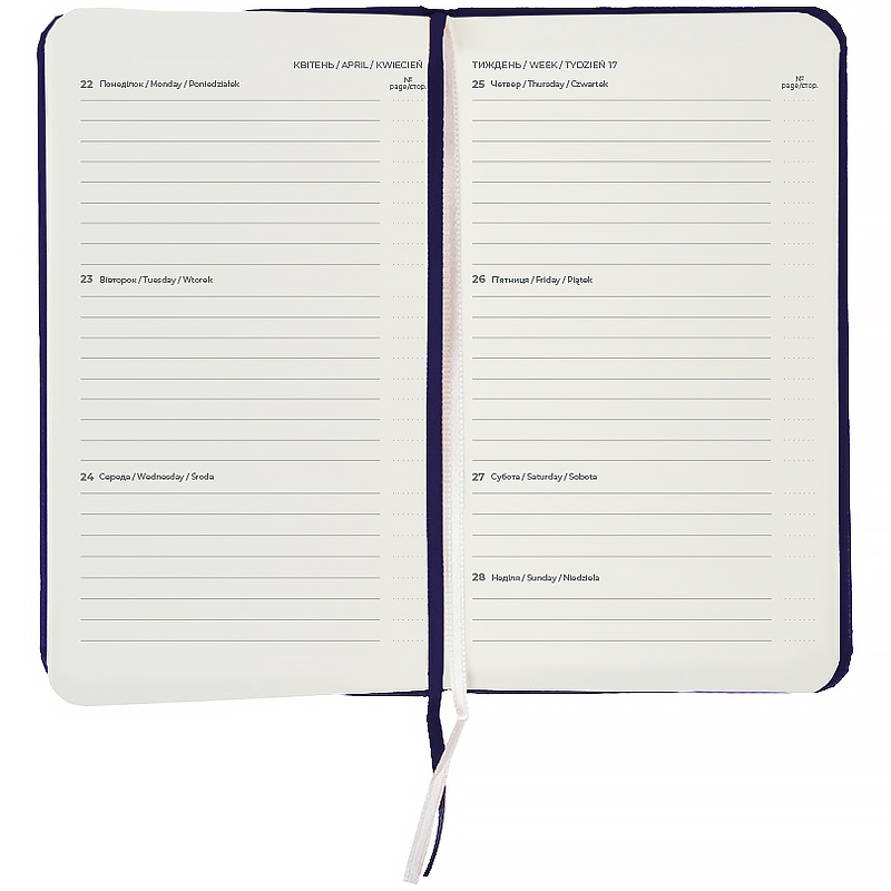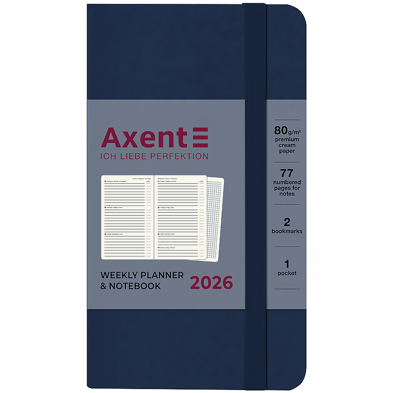 Карманный еженедельник Axent из серии Strong в твердой обложке. Используется для каждодневных записей, а также деловых и творческих задач. Твердый переплет из винила помогает сохранить аккуратный и презентабельный вид на протяжении долгого времени. Качественная кремовая бумага плотностью 80 г/м2 хорошо впитывает чернила и обеспечивает комфортное письмо. Удобно делать записи, чертить и рисовать. Еженедельник поделён на 2 части – датированный блок в линейку для удобного планирования дел и дополнительные листы в клетку для ведения личных записей. Внутренний блок на украинском языке. Планировщик содержит календарь на 2026-2027 год, общее расписание недели, поля для записи любимых книг, трекер полезных привычек, информацию о праздниках, важных телефонных номерах, часовых поясах стран мира, единицах измерения, шкале температур. Две разноцветные закладки-ляссе позволяют быстро найти и открыть нужные страницы. Содержит 96 листов, размер - 90*150 мм.