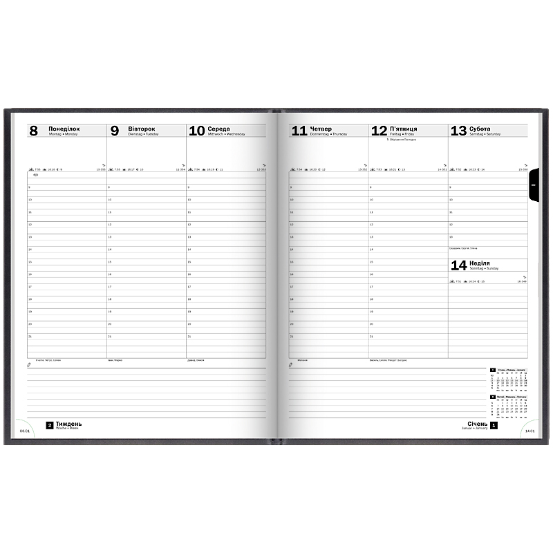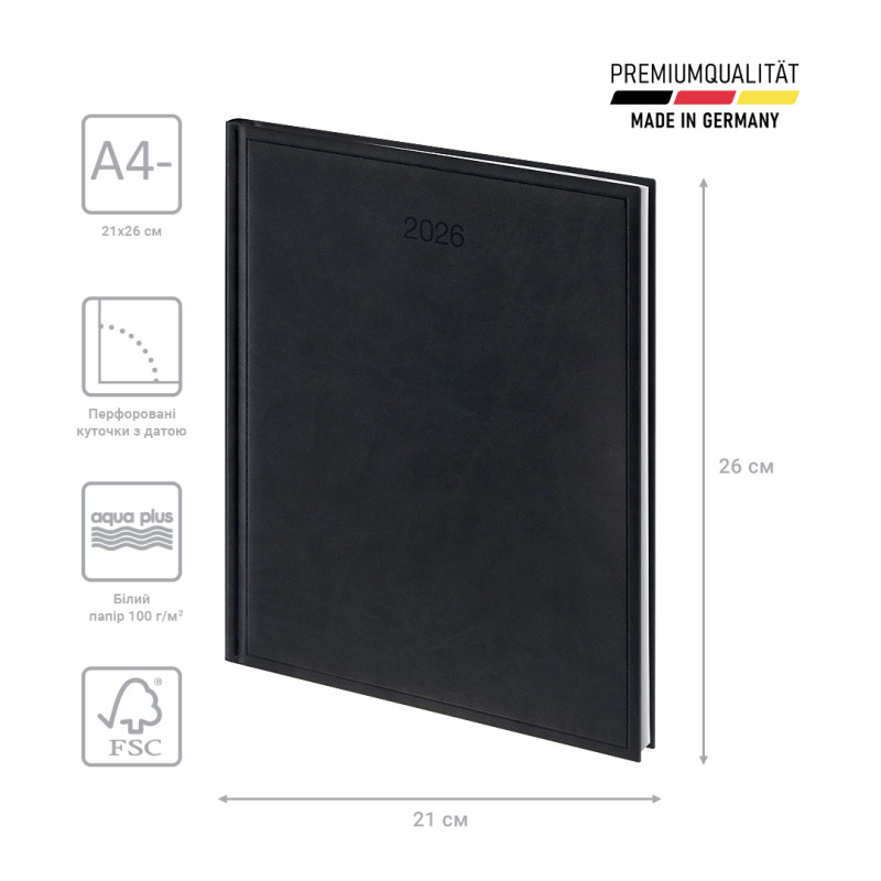 Еженедельник Brunnen 2026 Бюро – статусная модель для тех, кому важно детальное планирование дел. Особенности: Три языка: украинский, английский, немецкий. Формат А4 с разворотом недели. Две страницы – одна неделя. Общее количество страниц – 152. Европейская белая бумага 100 г/м2. Страницы общего планирования на год. Информационный блок. Алфавитная записная книжка. Органайзер времени с 09:00 до 21:00. Изысканные кремовые форзацы. Печать серого цвета. Дополнительные страницы с перфорацией. Отрывные датированные уголки и закладка-ляссе. Эффектная черная обложка Torino с лаконичным слепым тиснением.
