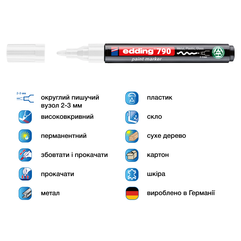 Лаковый маркер edding 790 обеспечивает чёткую, стойкую маркировку даже на тёмных поверхностях. Благодаря густым чернилам с высокой кроющей способностью и округлому наконечнику (2–3 мм), он подходит для точного нанесения. Пишет по таким материалам, как: металл, пластик, стекло, сухая древесина, картон, кожа, лакированные поверхности. Маркер обеспечивает долговечное и заметное покрытие как в помещениях, так и на улице. След от маркера устойчив к влаге, истиранию, свету и высоким температурам. Благодаря качественным спиртовым чернилам след от маркера быстро высыхает и не размазывается. Идеален для производств, мастерских и бытового использования. Чернила практически не имеют запаха, не содержат толуола и ксилола. Сделано в Германии.